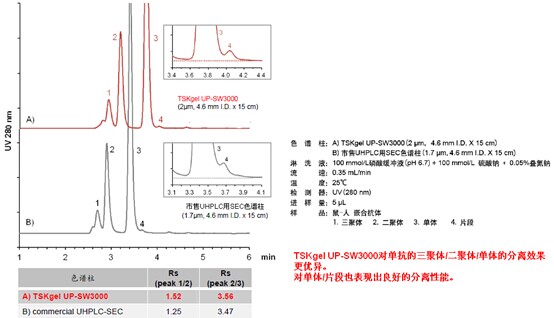 ?????? 抗體藥物中使用的單克隆抗體,在生產、貯藏或運輸過程中可能會形成二聚體等凝聚物,存在引發不良反應的風險因素,故在質量控制中采用體積排阻色譜法(SEC)對單克隆抗體進行分離分析。現有的TSKgel?G3000SWXL色譜柱常用于此用途,但仍需要更高分離度以及更短分析時間的SEC分析技術。現在2μm粒徑的高性能SEC?色譜柱TSKgel?UP-SW3000已實現了商品化,給您帶來更高效更快捷的分離體驗!