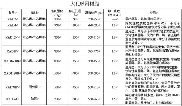 ??? 大孔吸附樹脂的骨架結構主要有苯乙烯、丙烯酸酯、丙烯腈、異丁烯等,致孔劑有甲苯、石蠟,溶劑有汽油、煤油、碳醇、聚乙烯醇等,分散劑有明膠等,交聯劑有二乙烯苯等。由于骨架的不同致使樹脂的極性也不同,通常分為非極性樹脂、弱極性樹脂和極性樹脂。