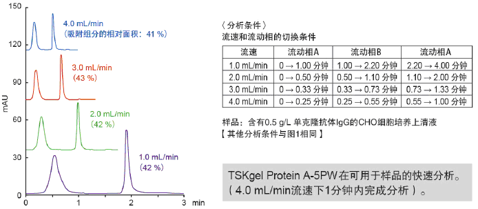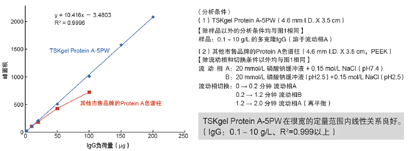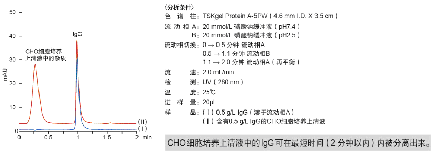 目前,人們對(duì)以免疫球蛋白(IgG)為主的抗體藥物的需求日益高漲。在抗體藥物的研發(fā)以及制備工藝建設(shè)中,由于IgG表達(dá)需進(jìn)行篩選,所以必須快速及準(zhǔn)確地定量細(xì)胞培養(yǎng)液中的IgG。而且,即使在工業(yè)制備過(guò)程中,IgG的定量也是重要的質(zhì)量控制項(xiàng)目之一。為此,日本東曹公司特推出以多孔親水性聚合物為基質(zhì),表面鍵合有重組Protein A官能團(tuán)的TSKgel Protein A-5PW親和色譜柱,用于IgG的快速、高分離度分析。