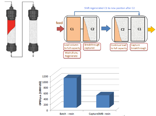 傳統層析工藝,由于流穿效應,有30-50%的填料是無法被完全利用的,從而使得載量和處理量大為受限。Capture SMB用于優化捕獲環節,作為最簡單和最強大的2柱位設計,可使純化效率顯著提高,并且使填料用量大為縮減。