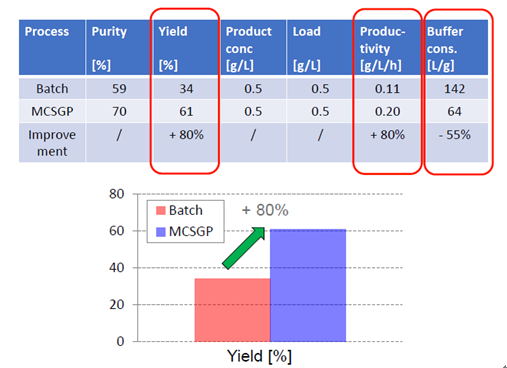 有案例證明,MCSGP可將產品純度從傳統工藝的59%提升至70%,將收率從傳統工藝的34%提升至61%,從而使產量(g /L /h)整體提升80%,并同時使Buffer的消耗量降低55%MCSGP工藝,無疑可顯著地節約成本投入,并可產生更多的生產效益。