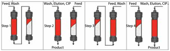 ? ? ?傳統(tǒng)層析工藝,由于流穿效應(yīng),有40-60%的填料是無法被利用的,從而使得載量和處理量大為受限。Capture SMB用于優(yōu)化捕獲環(huán)節(jié),作為最簡單和最優(yōu)化的2柱位設(shè)計(jì),可使純化效率顯著提高,并且使填料用量大為縮減。