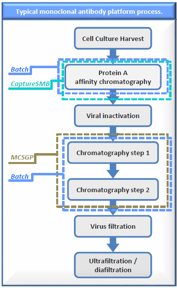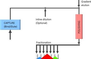 所有的Contichrom系統可以將兩個層析步驟(例如捕獲和精純)整合為一個單一的過程,第一步層析洗脫的產物可以直接被稀釋,從而直接進行第二步層析,因此省略了中間的間歇過程,這是非常適用于高生產量純化的。