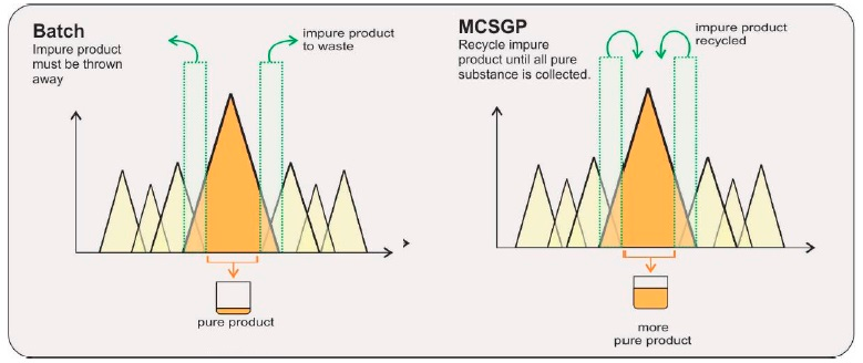 MCSGP(Multicolumn Countercurrent Solvent Gradient Purification)用于精純環節,無需通過耗時的實驗設計(DoE)確定工藝條件,可有效克服典型SMB(模擬移動床)僅適用于二元分離、無法實現線性梯度的缺點。