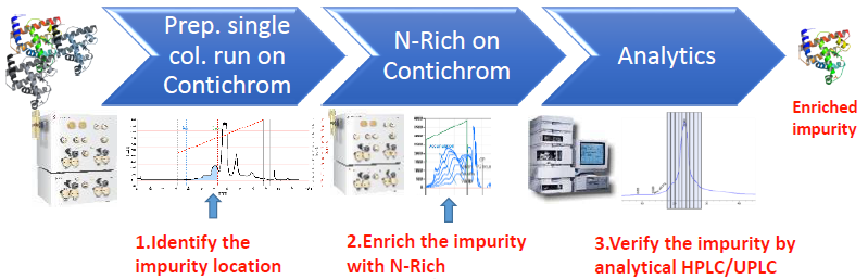 N-Rich工藝是微量物質的富集過程,比如將產品的相關雜質選擇性地富集在一個循環的層析過程中,待富集至目標量,再進行洗脫回收。該方法特別適用于分離與產品有關的雜質,如異構體和聚集體,并同時用于發現研究。